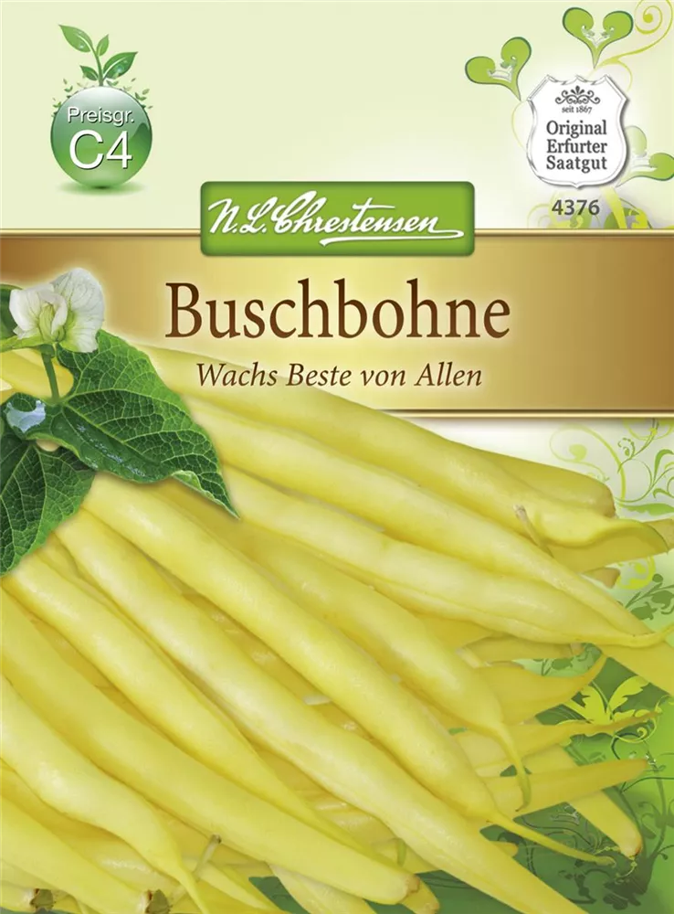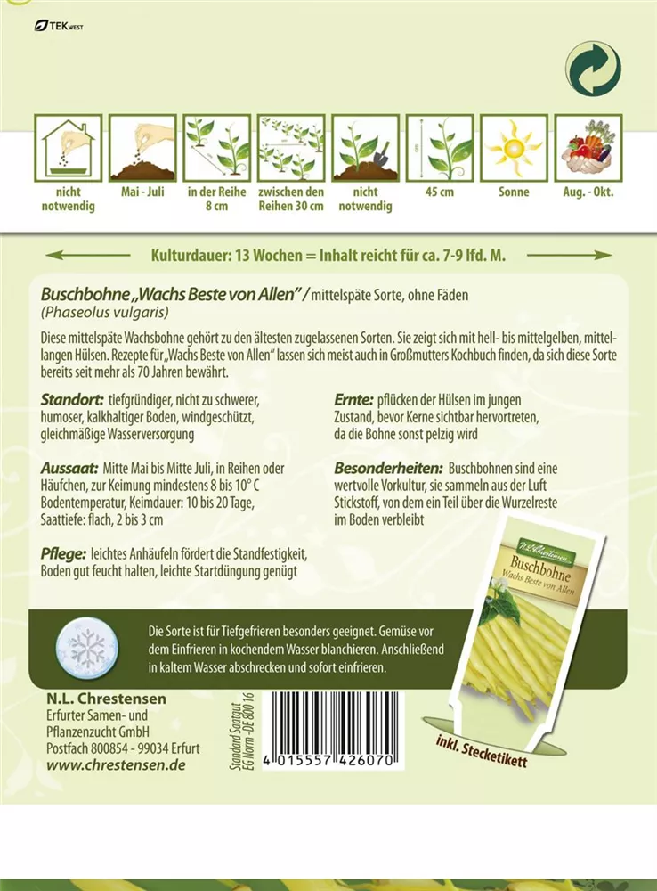 Die hellgelben Hülsenfrüchte haben einen aromatischen Geschmack. Reifezeit ab August.Die Hülsenfrüchte sind länglich.