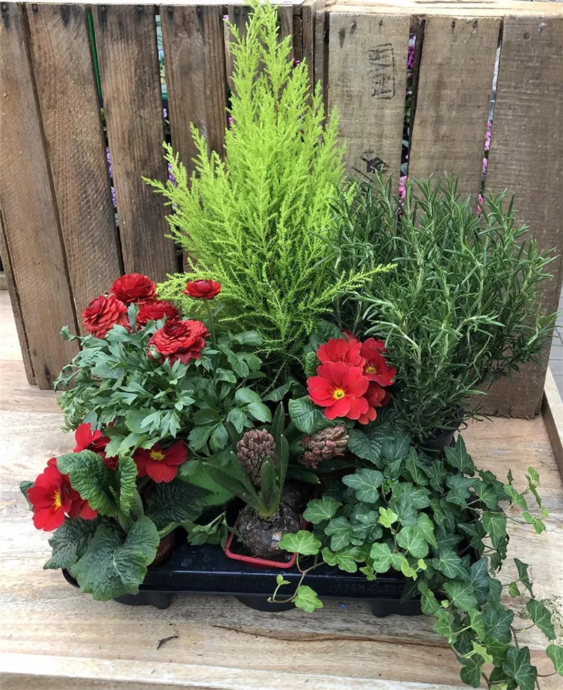 Frühlingsmix mit Primel, Hyacinthe, Efeu, Ranunkel, Rosmarin