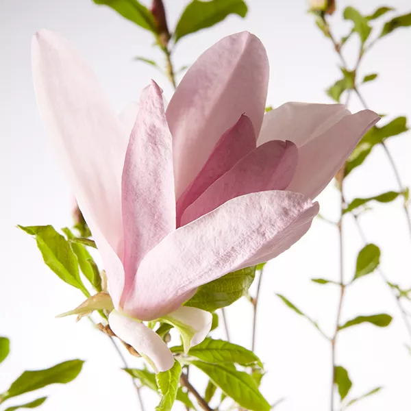 Die Tulpen-Magnolie (Magnolia x soulangeana) erreicht eine Höhe von gut 3 - 5 m. Die Blätter sind verkehrt eiförmig, bis etwa 15 cm lang und hellgrün. Die großen tulpenförmigen Einzelblüten, mit weißer Grundfarbe und rosavioletten Einfärbungen, erscheinen von April bis Mai vor dem Laubaustrieb. Besonders bei älteren Pflanzen treten die Blüten in beeindruckender Fülle auf. Diese Art sollte unbedingt alleine stehen, damit sie ihre ganze Pracht entfalten kann.