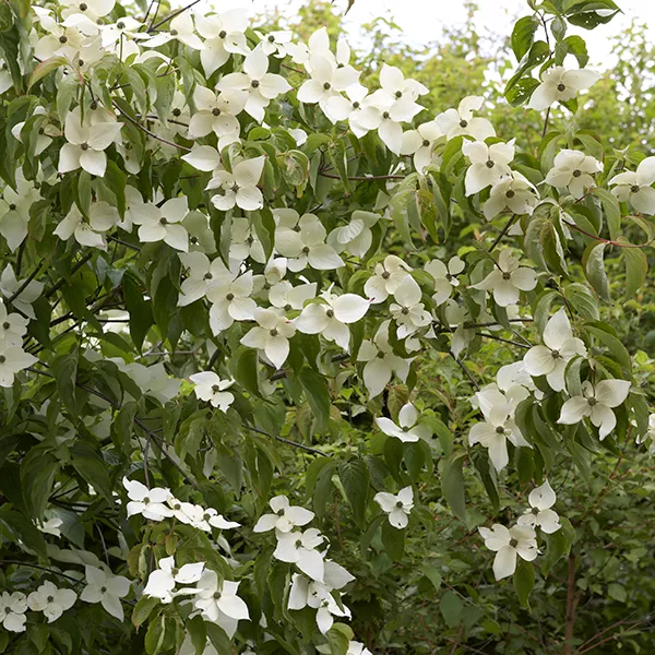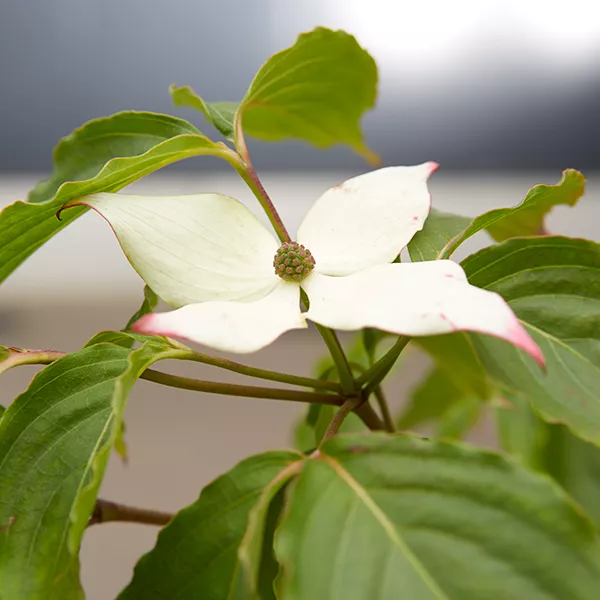 Der Chinesische Blumenhartriegel (Cornus kousa) wächst straff und kann gut eine Höhe von 5 - 6 m erreichen. Seine eher unscheinbaren Blüten bildet er in der Zeit von Mai bis Juni. Sie werden von vier großen, weißen Hochblättern umrahmt und sind so für jedes Auge ein Blickfang. Es gibt auch Sorten mit cremeweißen oder rosafarbenen Hochblättern. Ab September entwickeln sich rosafarbene, himbeerähnliche Früchte. Seine Herbstfärbung, die je nach Sorte gelb bis dunkelrot ist, macht ihn zu einem der schönsten Gehölze im Garten. Blumenhartriegel stehen gern sonnig bis halbschattig.
