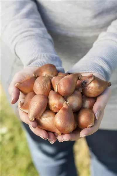 Mit einer oder besser gleich mehreren Tüten Blumenzwiebeln werden jetzt, mitten im Herbst, schnell erste Frühlingsgefühle geweckt. In unseren Gartencentern gibt es lose Blumenzwiebeln zum selber aussuchen, aber auch die klassische Verpackung – Zwiebeln im Netz oder in der Papiertüte – gibt es in allen vorstellbaren Varianten. Bis in den Dezember bzw. solange die Erde noch nicht gefroren ist, können die Blumenzwiebeln problemlos gesetzt werden. Beim Kauf ist es wichtig darauf zu achten, dass die Zwiebeln frisch und schön fest sind, eine glatte Haut haben und noch nicht austreiben. Dann haben sie viel Kraft zum Einwachsen und werden zu kräftigen Pflanzen mit großen Blüten. Dafür benötigen die Blumenzwiebeln einen sonnigen bis halbschattigen Standort und nährstoffreiche, durchlässige Erde. Als Faustregel beim Pflanzen gilt, dass die Pflanztiefe immer doppelt so tief ist, wie die Zwiebel hoch ist.