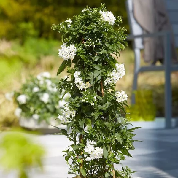 Der feine Jasmin (Solanum jasminoides) ergänzt jedes Balkon- oder Terrassenarrangement wunderbar. Im Nu zaubert er exotische Eleganz herbei. Das Tolle an ihm: Er blüht nicht nur schön, sondern duftet auch noch! Als Stämmchen oder als Pyramide wirkt der Jasmin besonders chic. Sonnig und windgeschützt gedeiht der Südamerikaner optimal. Achten Sie darauf, ihn regelmäßig zu düngen, denn er ist sehr hungrig nach Nährstoffen. Im Sommer 1 x pro Woche ist optimal. Dann wird er sehr schnell wachsen und Sie Ihrem kleinen Garten näher bringen.