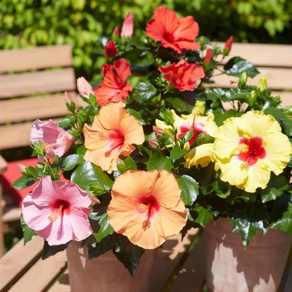 Der Hibiskus wird oft drinnen gehalten. Von Juni bis August blüht er aber auch wunderbar auf Balkon oder Terrasse. Sein Angebot reicht vom kleinen Strauch bis hin zum Stämmchen.