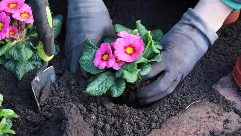 Gepflanzt werden Primeln an einem frostfreien Tag. Eine ungerade Anzahl von Pflanzen sieht am besten aus. Um das Arrangement vorab festzulegen, kann man die Blumen zunächst auf dem Beet verteilen.