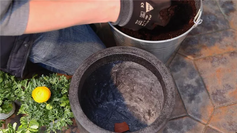 Bevor Sie handelsübliche Blumenerde in den Topf füllen, sollten Sie das Loch aber leicht bedecken: Zum Beispiel mit einer Tonscherbe. Diese verhindert, dass das Abzugsloch verstopft.