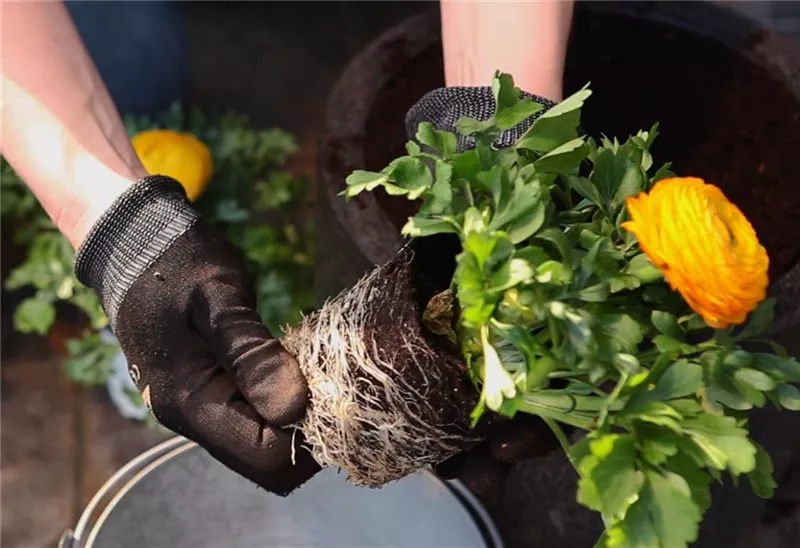 Wenn Sie die Pflanzen in ein größeres Gefäß umsetzen, sollten Sie zunächst die alten Töpfe entfernen, damit die Ranunkeln neue Wurzeln bilden und sich so optimal mit Wasser und Nährstoffen aus der neuen Erde versorgen können.