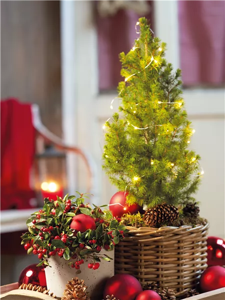 Die Zuckerhutfichte (Picea glauca) ist die perfekte Kandidatin für eine natürliche Weihnachtsdekoration auf Balkon und Terrasse. An einem sonnigen bis halbschattigen Platz fühlt sich die langsam wachsende Fichte auch an Eingängen oder Terrassen wohl. Mit weihnachtlichen Dekorationselementen oder LED-Lichterketten lässt sie sich im Hand-umdrehen in einen kleinen Weihnachtsbaum verwandeln.