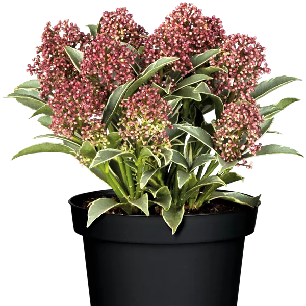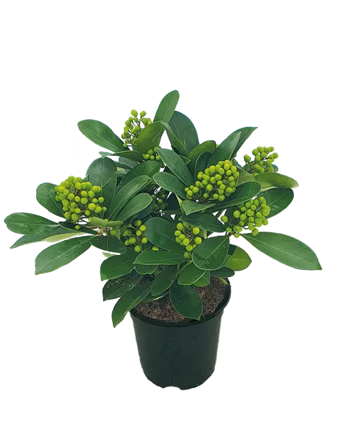 Die Japanische Skimmie (Skimmia japonica 'Veichtii') ist ein kompakt wachsender immergrüner Kleinstrauch. Seine dekorativen, roten Früchte bleiben sehr lange haften. Weiße, wohl duftende Blüten erscheinen im Mai an Rispen und eignen sich sehr gut für den Vasenschnitt. Auch die Blätter duften leicht. Diese Skimmie eignet sich sowohl solitär als auch für eine Heckenpflanzung.