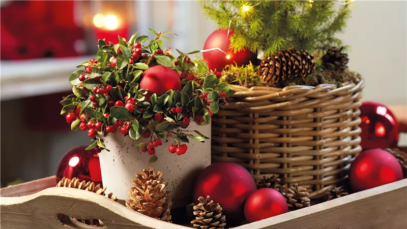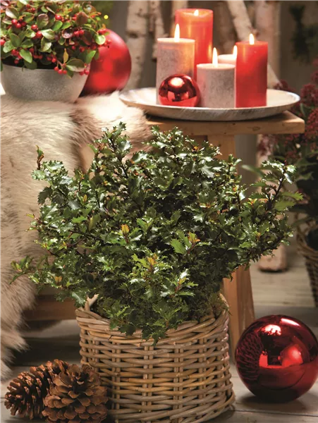 Stechpalmenzweige mit Früchten daran haben in England und Amerika eine lange Tradition als Weihnachtsdekoration. Die Stechpalme (Ilex aquifolium) ist auch im Topf eine dekorative Pflanze. Sie wächst blickdicht und ist ein immergrüner Allrounder mit einer markanten Blattform. Die Stechpalme ist unkompliziert und kommt mit jedem Standort zurecht. Nur Staunässe mag sie gar nicht, gießen Sie sie deshalb eher weniger als zu viel.