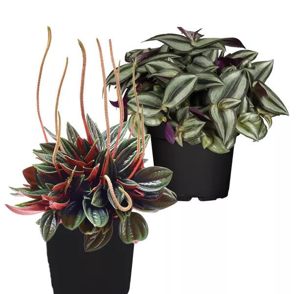 Die Grünpflanzen 'SMITS-COLLECTION' bringen Vielfalt und Frische ins Zuhause. Die Pfefferpflanze (Peperomia) besticht durch ihre dekorativen Blätter in spannenden Strukturen. Das Zebrakraut (Tradescantia) fällt sofort mit seinem markanten Streifenmuster auf und sorgt für lebendige Kontraste. Das Schönpolster (Callisia) begeistert dagegen mit dichtem, teppichartigem Wuchs und einer besonders kompakten Form. Alle Sorten sind pflegeleicht, gedeihen am besten an einem hellen Standort ohne direkte Sonne und benötigen nur mäßige Wassergaben.