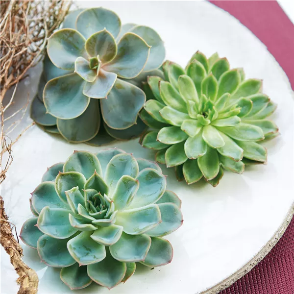 Die Echeverie (Echeveria) ist eine Besonderheit: Ihre Rosetten wirken wie kleine Kunstwerke der Natur. Zum Trend "GLAMOUR TIME" passt sie ideal, denn ihre klare Form und der leichte Schimmer der Blätter betonen Eleganz und Extravaganz. Spannend ist zudem, dass sie auch wurzellos dekoriert werden kann, etwa in Schalen, auf Tabletts oder zwischen Kerzen. Pflegeleicht und genügsam braucht sie nur wenig Wasser, ein heller Standort erhält ihre Form und den Glanz. So wird die Echeverie zum vielseitigen Begleiter, der Natürlichkeit und Glamour verbindet.
