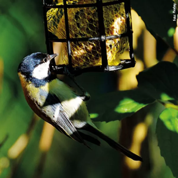 5. Besonders geeignet sind Meisenringe und -knödel sowie Futtersäulen und -ampeln. Sie verringern die Gefahr einer Krankheitsübertragung und können an vielen verschiedenen Stellen im Garten und Balkon angebracht werden. So bieten Sie eine Vielzahl an kleinen frischen und sauberen Futterplätzchen.