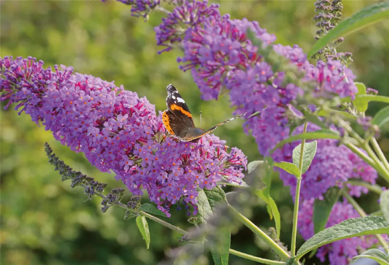 Wer ist nicht besser geeignet, um Schmetterlinge anzulocken, als der Schmetterlingsflieder (Buddleja davidii)? So wird der Sommerflieder meist genannt, weil er neben Insekten auch sehr viele Schmetterlingsarten durch seinen intensiven Duft anlockt. Während seiner Blütezeit von Juli bis Oktober können Sie beobachten, wie unzählige Schmetterlinge den süßen Nektar aus den Blüten saugen. An einem sonnigen Standort fühlt sich der Schmetterlingsflieder besonders wohl und kann hier eine Wuchshöhe von 120 bis 300 cm erreichen.