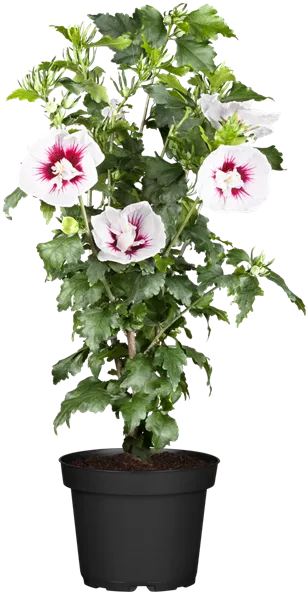 Der Gartenhibiskus (Hibiscus syriacus), auch Garteneibisch genannt, beeindruckt mit seinen exotischen Blüten. Das winterharte Gehölz blüht von Juli bis in den Herbst mit wunderschönen, schalenförmigen Blüten. Als Strauch oder kleiner Baum ist diese Pflanze vielfältig einsetzbar. Der Hibiskus kann sehr gut als Solitär stehen, aber ebenso gut in einer harmonischen Gruppe oder sogar als freiwachsende Blütenhecke.