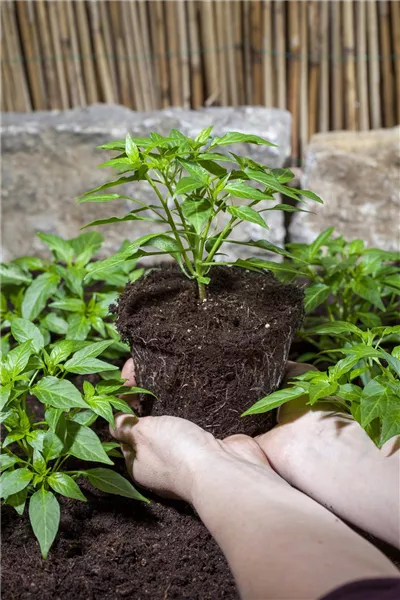 War die Anzucht erfolgreich, ist es nun an der Zeit, die Paprika in den Garten auszupflanzen. Wie bereits erwähnt, bevorzugt die Pflanze ein eher wärmeres Klima, weshalb man mit dem Einpflanzen im Beet warten sollte, bis die Temperaturen ansteigen. Ende Mai ist ein guter Zeitpunkt, um Frost garantiert zu umgehen. Wird die Paprika-Pflanze bereits vor Mai in den Außenbereich gesetzt, kann dies zur Folge haben, dass die Pflanze aufhört zu wachsen und keine richtigen Früchte bildet. Wer in kühleren Regionen wohnt, aber dennoch nicht auf den eigenen Anbau verzichten möchte, der kann alternativ die Paprika im Topf belassen und nur bei hochstehender Sonne nach draußen stellen. In der Nacht wird das Gemüse einfach zurück ins Warme geholt.
