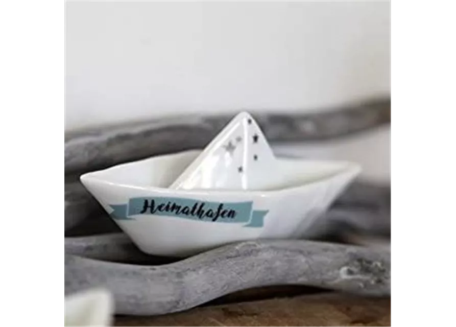 Traumboot Heimathafen, groß. Mit diesen Booten aus glasiertem Porzellan kommen Sie im Heimathafen an. Als Ablage für Ringe, als Botschaft oder als Geschenk. Mit den Traumbooten fahren Sie im Meer der guten Wünsche.