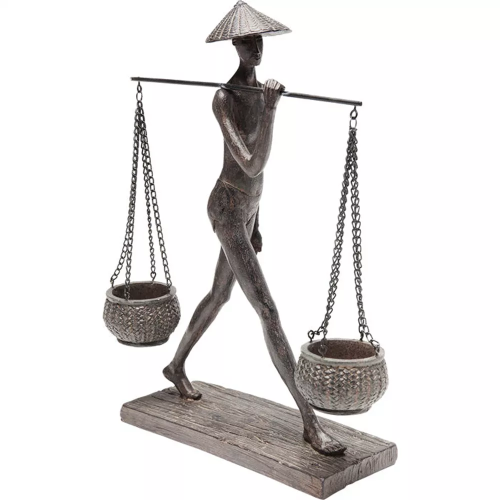 Dekorative Skulptur eines Bauern mit traditionellem Strohhut und Tragejoch im Asienstil