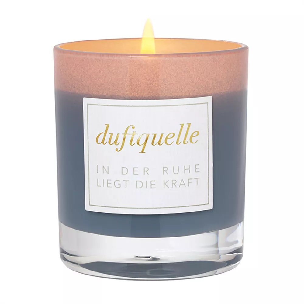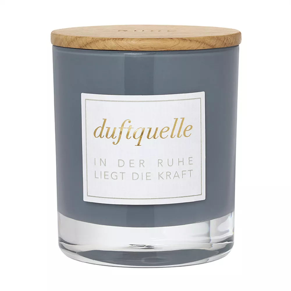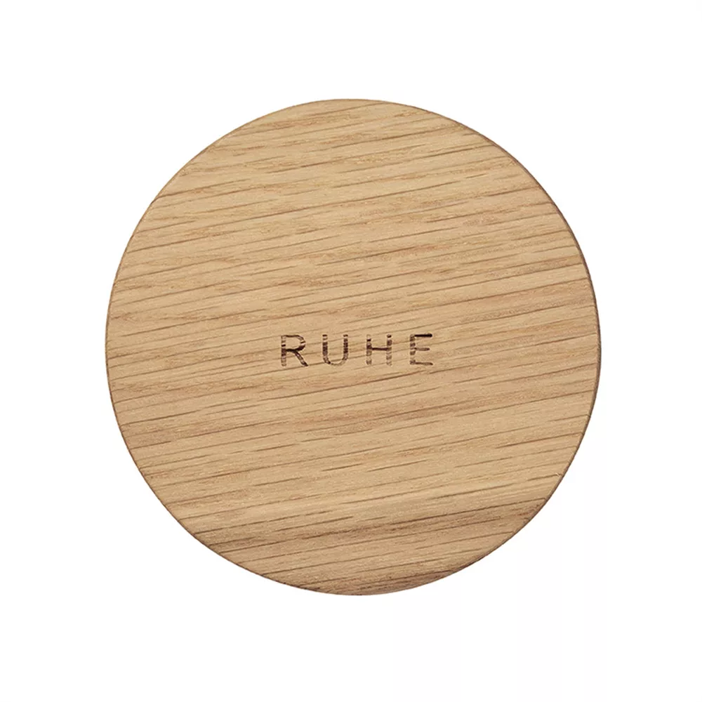 Das Motto der Kerze lautet: In der Ruhe liegt die Kraft. Liebevoll wurde der Schriftzug "Ruhe" oben in den Deckel aus echtem Eichenholz graviert.