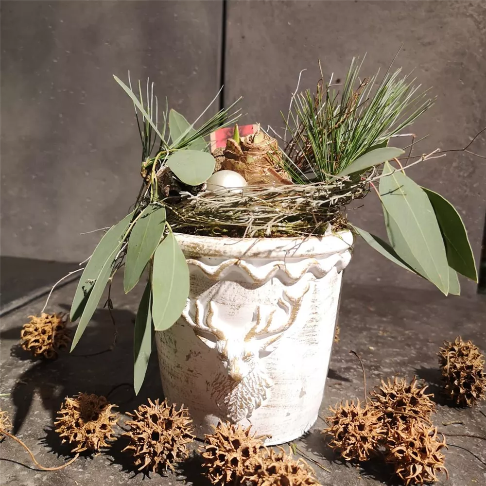 mit Seidenkiefer und Eucalyptus im weißen Topf mit Hirschmotiv