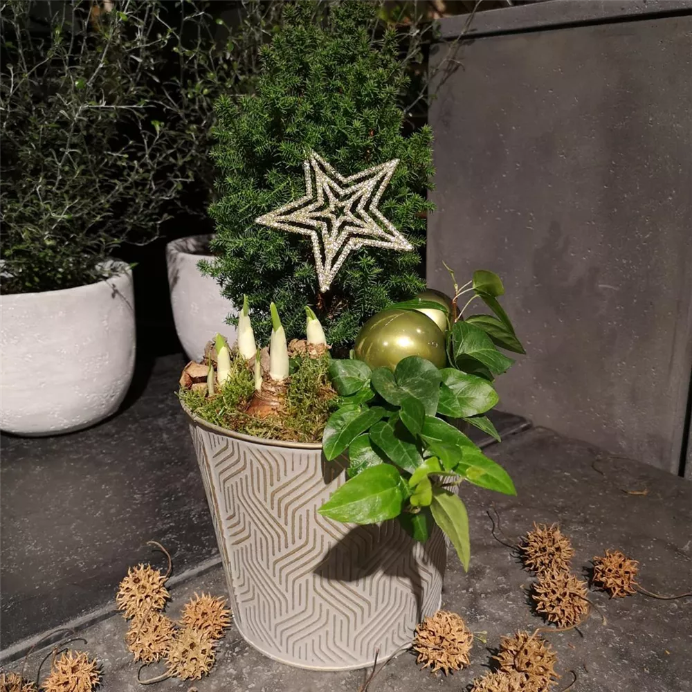 Mini-Konifere undFrühlingsblühern - festlich arrangiert mit Weihnachtskugel und Glitzerstern.