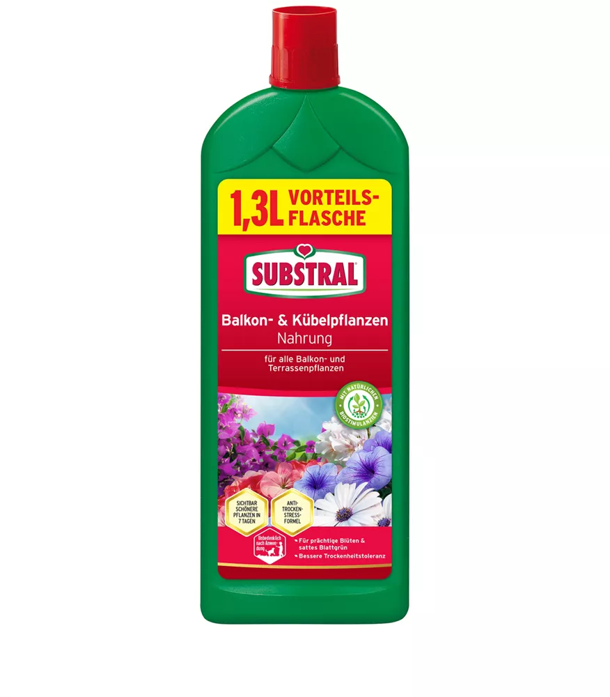 SUBSTRAL Balkon-& Kübelpflanzen Nahrung ist ein hochwertiger Flüssigdünger mit natürlichen Biostimulanzien, der Ihre Pflanzen vom ersten Tag an mit allen wichtigen Haupt- und Spurennährstoffen versorgt. Er sichert ein prächtiges und gesundes Wachstum und stärkt gleichzeitig ihre Widerstandskraft bei Trockenheit oder schlechten Bodenbedingungen.