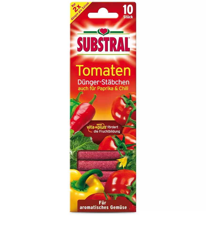 SUBSTRAL Dünger-Stäbchen für Tomaten versorgen Tomatenpflanzen und anderes Fruchtgemüse gleichmäßig und wohldosiert mit einer ausgewogenen, speziell auf diese Pflanzen abgestimmten Kombination wertvoller Nährstoffe. Sie sorgen für kräftige Pflanzen und reiche Ernte von schmackhaften, festen Früchten.
