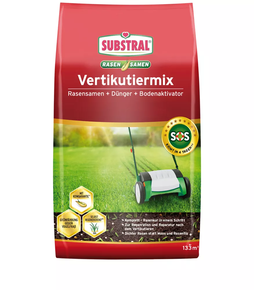 - SUBSTRAL Vertikutiermix besteht aus schnell keimenden Grassorten, Startdünger und einem Bodenaktivator