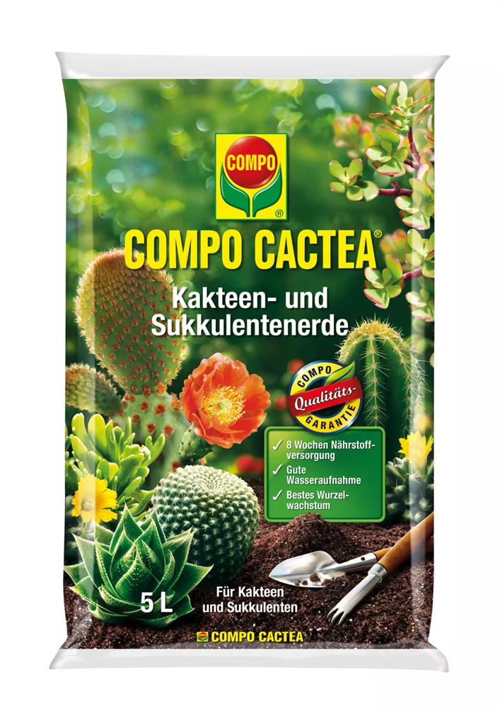 Hochwertige Spezialerde für alle Kakteenarten und Sukkulenten. Das auf die Bedürfnisse der Pflanzen abgestimmte Dünger-Depot wirkt sofort und gewährleistet eine bis zu 8 Wochen optimale Nährstoffversorgung. Hochwertiger Quarzsand, Perlite Atmungsflocken und der COMPO Wurzelaktivator sorgen für eine gute Wasseraufnahme im Substrat, eine lockere, luftige Struktur sowie bestes Wurzelwachstum.