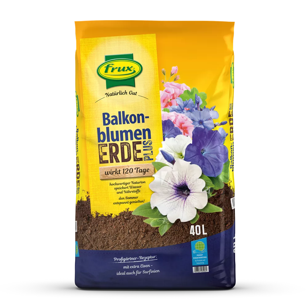 Die Balkonblumenerde Plus – mit Depotdünger ist ein gebrauchsfertiges Kultursubstrat, das genau auf die Bedürfnisse Ihrer Geranien, Petunien und anderer Balkonpflanzen abgestimmt ist. Durch den hohen Anteil an Naturton und die Verwendung von hochwertigen Torfersatzstoffen und Torf mit optimaler Struktur garantiert diese Erde eine sehr gute Wasser- und Nährstoffspeicherung. Die Erde bleibt vergießfest, atmungsaktiv und gibt durch den hohen Tonanteil Wachstums- und Blühsicherheit auch während länger dauernder Hitze- und Nässeperioden. frux Balkonblumenerde Plus enthält Vorratsdünger für 120 Tage und alle für das Pflanzenwachstum notwendigen Nährstoffe. Durch diese Grundversorgung wird das Wachstum der Balkonpflanzen optimal gefördert und ihre Pflege erleichtert.