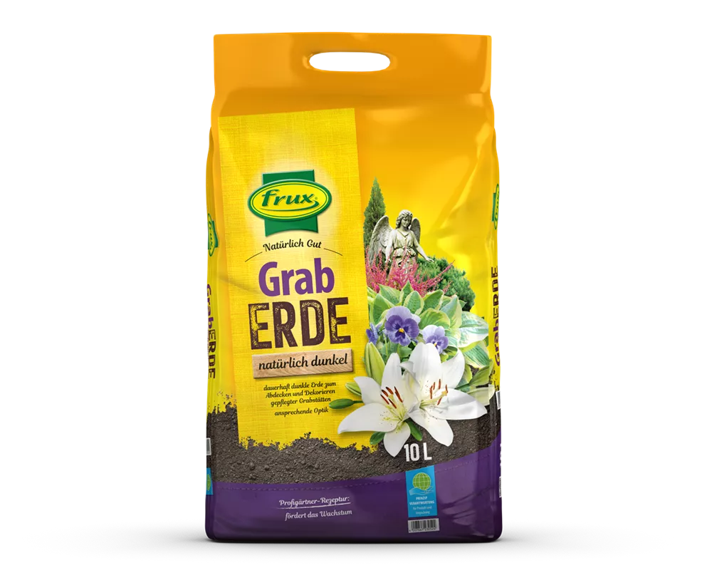 Die frux Graberde ist ein gebrauchsfertiges Substrat aus dem bewährten frux Erdensortiment für die Abdeckung und Dekoration von Gräbern. Durch ihre intensive Farbe hebt sich frux Graberde deutlich vom Grün der Blätter und den Blütenfarben ab und bringt diese dadurch stärker zur Geltung. Sie bildet einen reizvollen Kontrast zur Grabbepflanzung und verleiht den Gräbern ein würdevolles Aussehen. Beim Abbau der frux Graberde wird der Boden zusätzlich mit organischem Material angereichert.