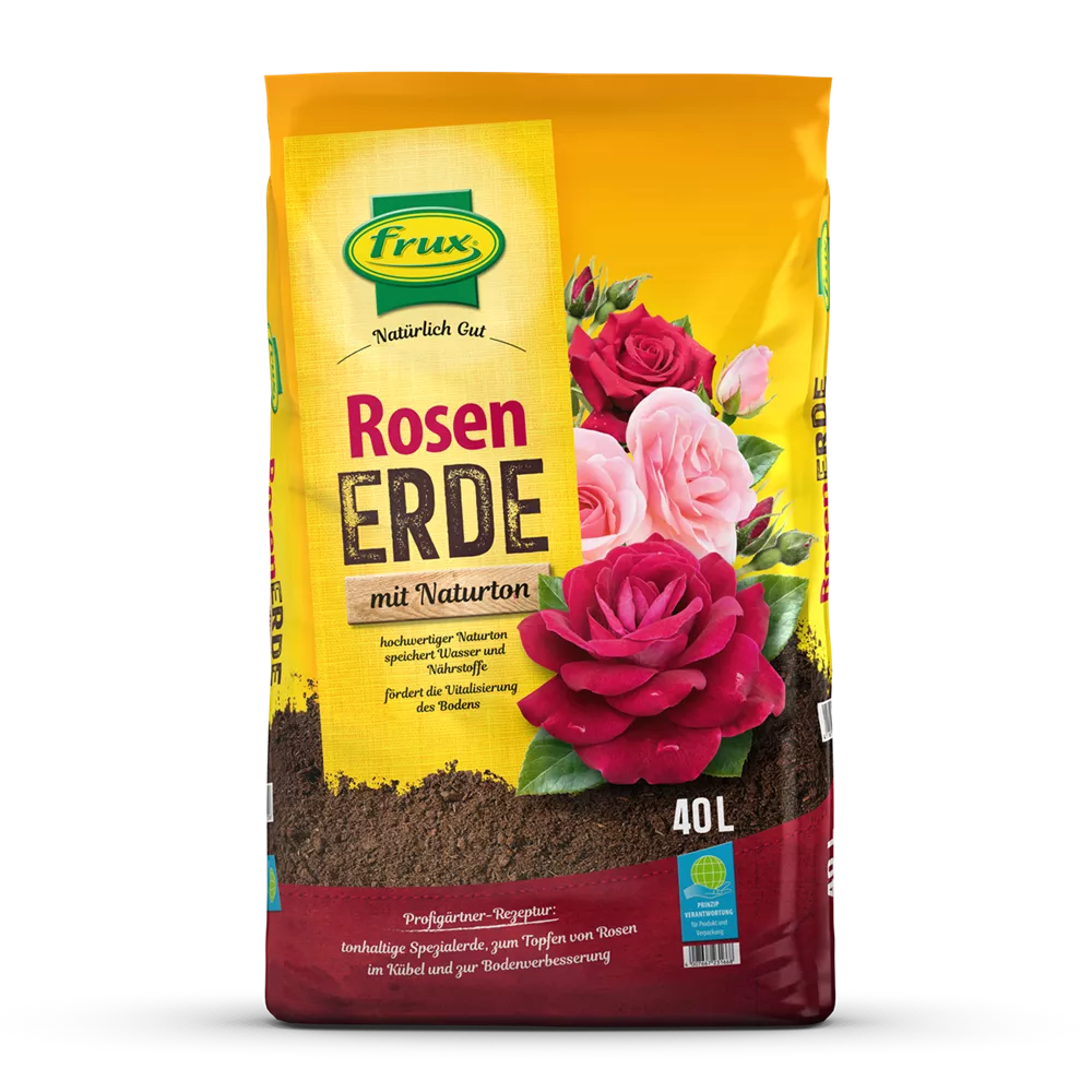 frux Rosenerde – die Pflanzerde für Rosen mit hohem Anteil an frischem Naturton und Struktur bildendem Rindenhumus. Besonders gut zum Pflanzen von wurzelnakten Rosen im Garten oder auch in Kübel geeignet. Mit allen erforderlichen Nährstoffen. Fördert das Anwachsen, die Weiterentwicklung und den Blütenansatz der Rosen.