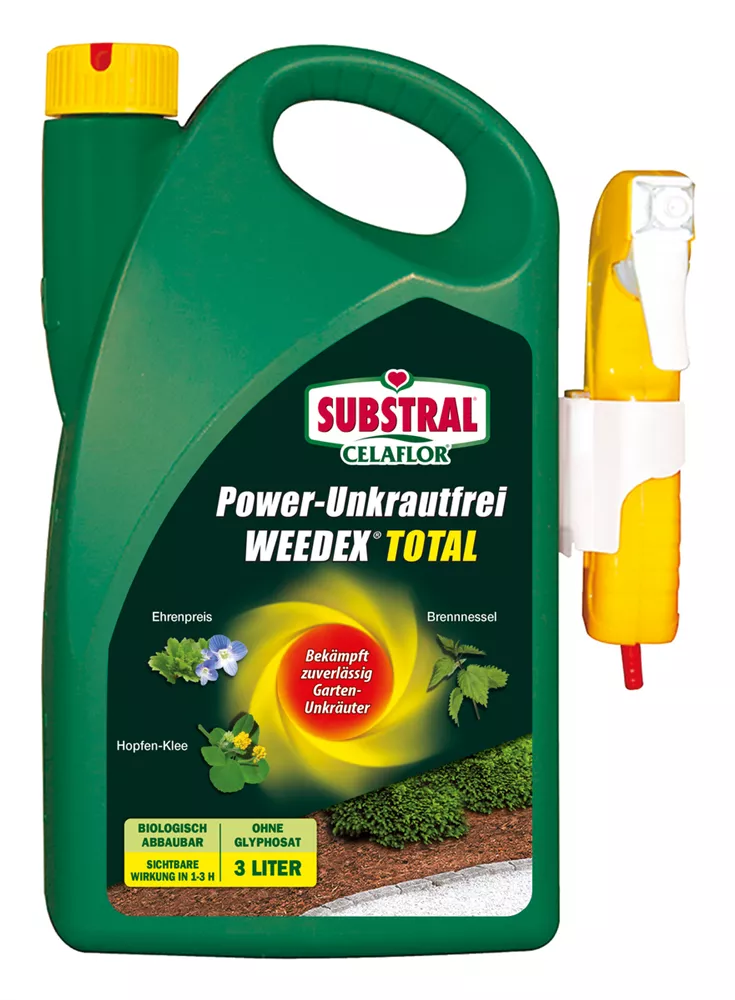 Power-Unkrautfrei WEEDEX TOTAL ist ein anwendungsfertiges Spray und bekämpft schnell und wirksam einjährige zweikeimblättrige Unkräuter und Ungräser in Beeten und auf unbefestigten Gartenwegen mit Holzgewächsen. Da es nur auf grüne, nicht verholzte Pflanzen und Pflanzenteile wirkt, können Unkräuter unter Bäumen und Sträuchern bekämpft werden. Je nach Witterung ist die Wirkung bereits innerhalb einer Stunde sichtbar. Auch alle grünen, oberirdischen Pflanzenteile von mehrjährigen Unkräutern werden geschädigt. Anwendung durch nichtberufliche Anwender zulässig. Biologisch abbaubar: der Wirkstoff wird im Boden durch Mikroorganismen zersetzt.