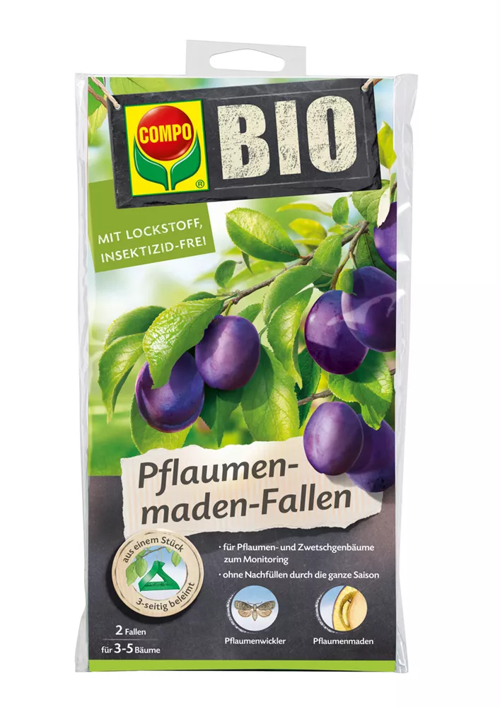Mit der COMPO BIO Pflaumenmaden-Falle werden die Männchen abgefangen, sodass Befruchtung und Eiablage reduziert werden. Die Falle dazu ab Mitte Mai aufhängen und spätestens nach 6 Wochen auswechseln. Zusätzlich sollten die befallenen Früchte eingesammelt und vernichtet werden (nicht kompostieren), solange sich die Maden noch darin befinden. Um den Befall im folgenden Jahr weiter zu reduzieren, sollten die Bäume bis April auf überwinternde Larven untersucht werden. Diese lassen sich dann leicht von der Rinde entfernen.