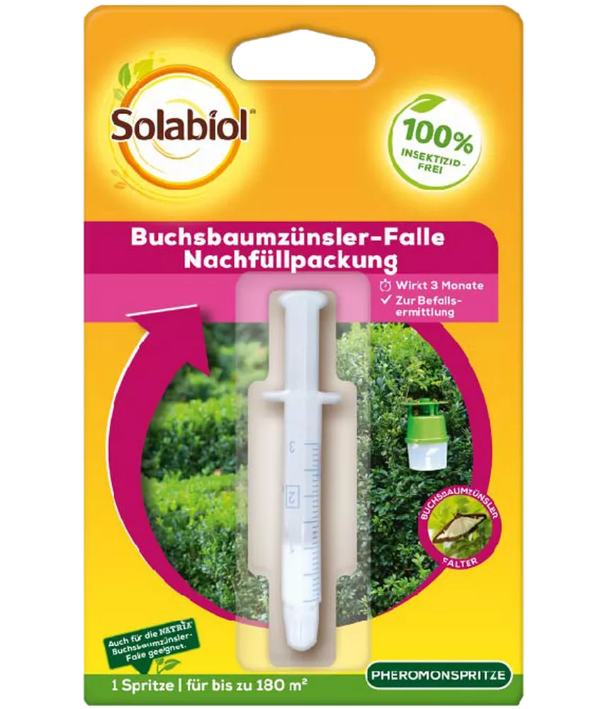 Ein sauberes und schnelles Nachfüllen der Solabiol® Buchsbaumzünsler-Falle wird durch die praktische Nachfüll-Pheromonspritze gewährleistet. Das Pheromongel lässt sich zur Nachfüllung aller auf dem Markt befindelichen Fallen nutzen.