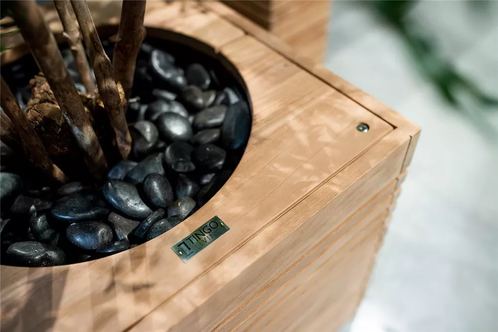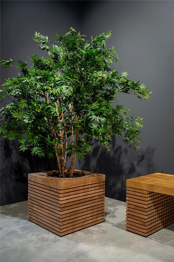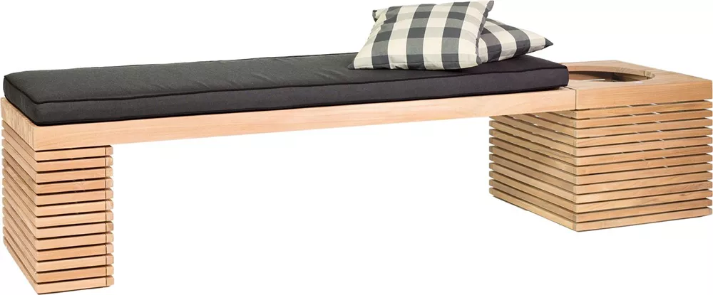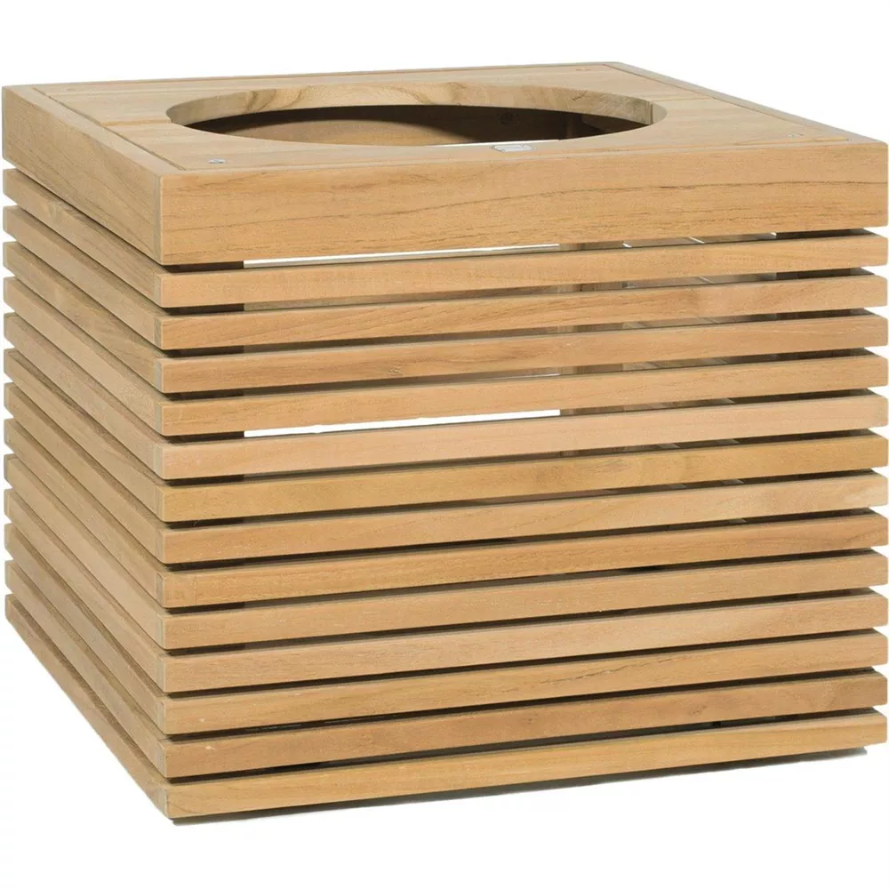 Eine formschöne und moderne Komplettlösung für die Gestaltung des Außenbereiches bietet die Serie MODULO aus massivem Plantagen-Teakholz in natürlichem Braun. Das würfelförmige Pflanzgefäß MODULO ist als „Stand-Alone” ein schöner Blickfang, aber es lässt sich auch mit den entsprechenden Einzelteilen zu einer bequemen und modernen Bank mit integriertem Pflanzgefäß zusammensetzen. Die zweiteilige Abdeckung mit runder Öffnung kann für ein einfaches Bepflanzen leicht abgenommen werden. Optional erhältliche höhenverstellbare Füße und Rollen garantieren zudem einen flexiblen Einsatz der Pflanzgefäße auf der Terrasse, im Garten oder in der Gastronomie (pro Gefäß 2 x 19895 Stellfüße oder 1 x 19894 Gelenkrollen bestellen). Zur idealen Bepflanzung empfehlen wir entweder einen STARLINE-Rohling in 37 cm Durchmesser (Art. 15394) oder einen Pflanzeinsatz in 40 cm Durchmesser (Art. 16230).