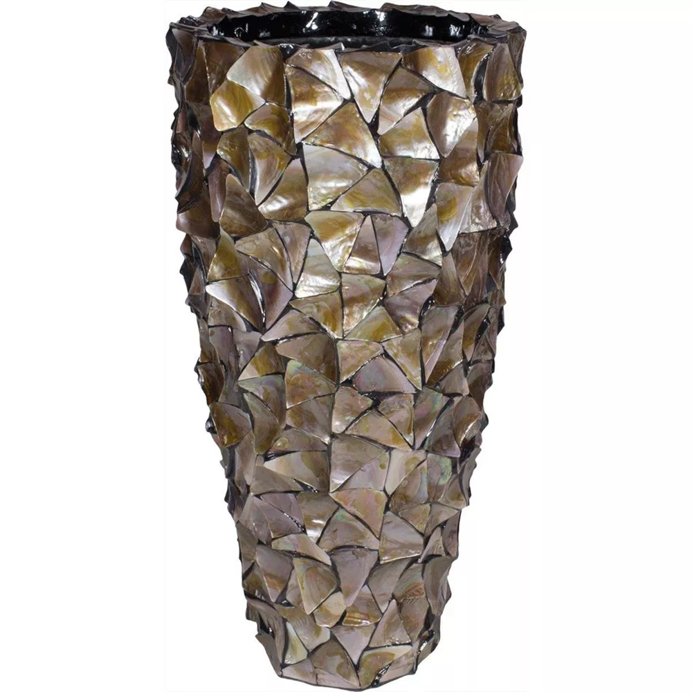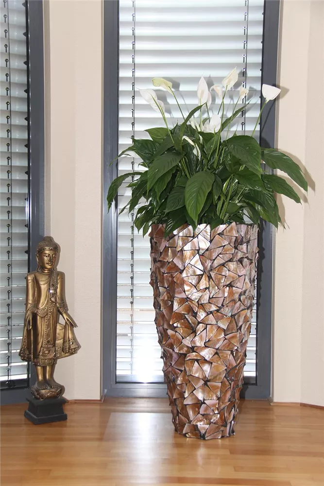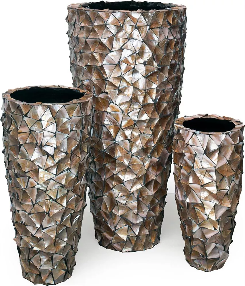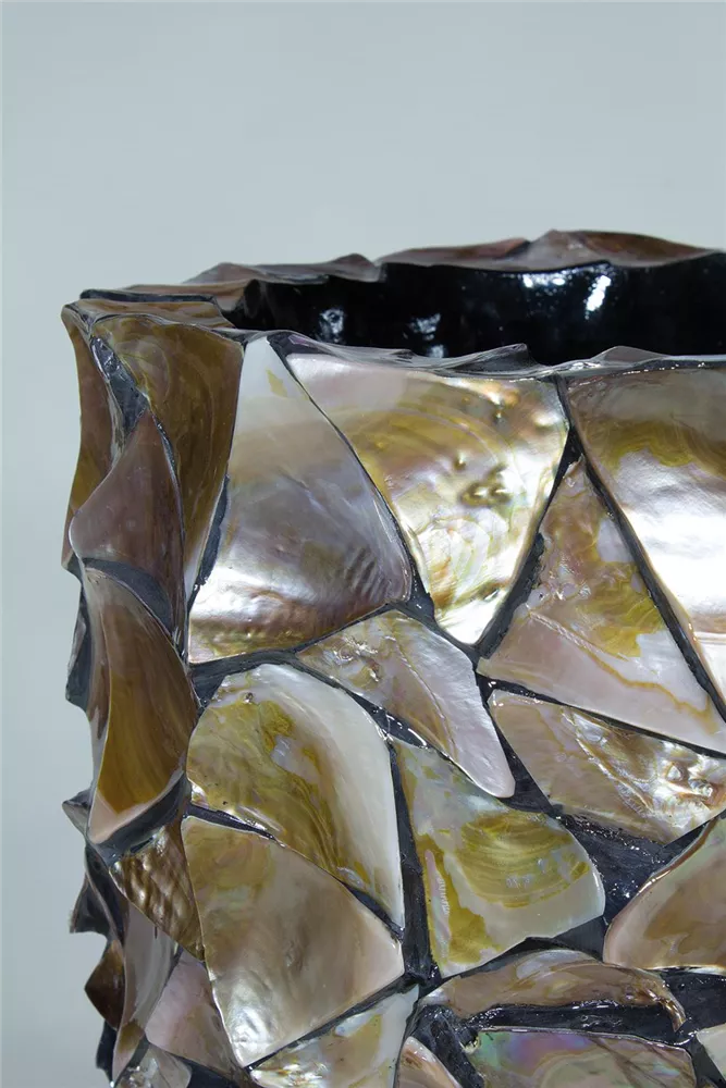 Echte, in Handarbeit aufgebrachte Muscheln machen die Produkte der Serie zu einem exklusiven und schimmerndem Highlight in jeder Dekoration. Mit großem Aufwand und in Präzision werden die drei- und rechteckigen Muschelstücke aus weißem, braunem oder schwarzem Perlmutt auf den Korpus der Artikel aufgebracht, bevor sie verfugt und abschließend noch einmal überarbeitet werden. Zu der Serie gehören neben je vier Pflanzgefäßen in verschiedenen Formen und Größen, auch Schalen, Tischgefäße, Säulen und Orchideentöpfe und geben Ihnen somit die Möglichkeit, die Muschel-Gefäße als stimmungsvolles und exklusives Gesamtkonzept anzubieten.