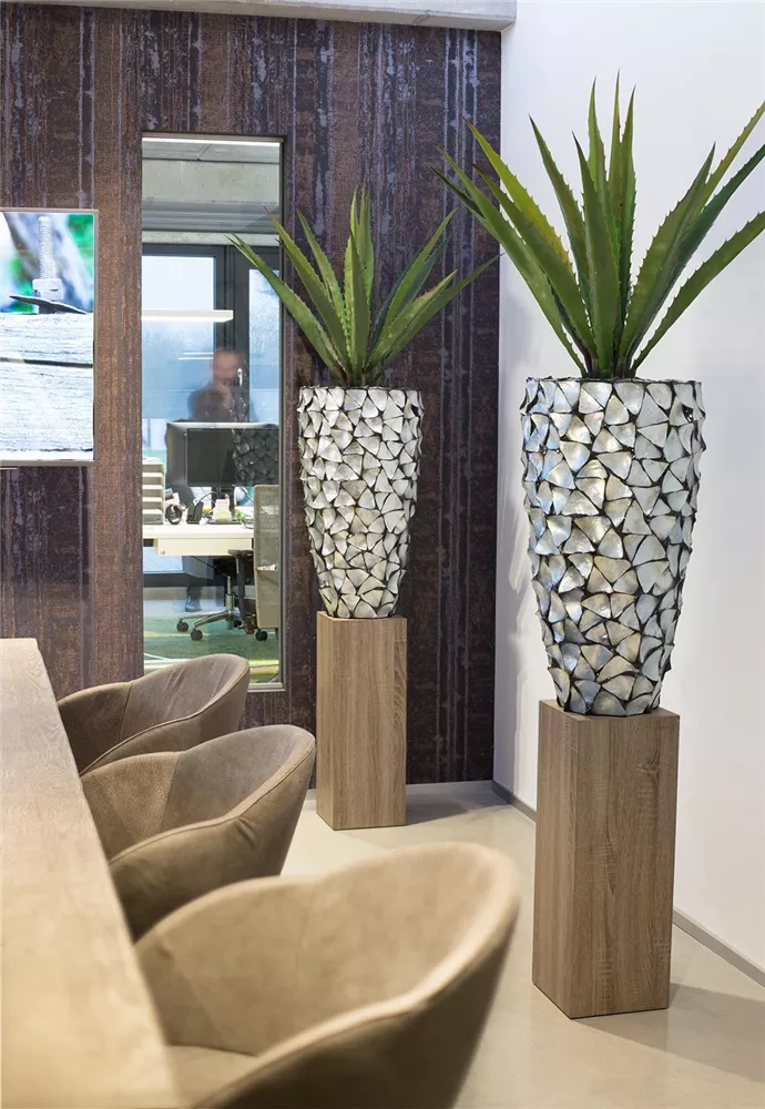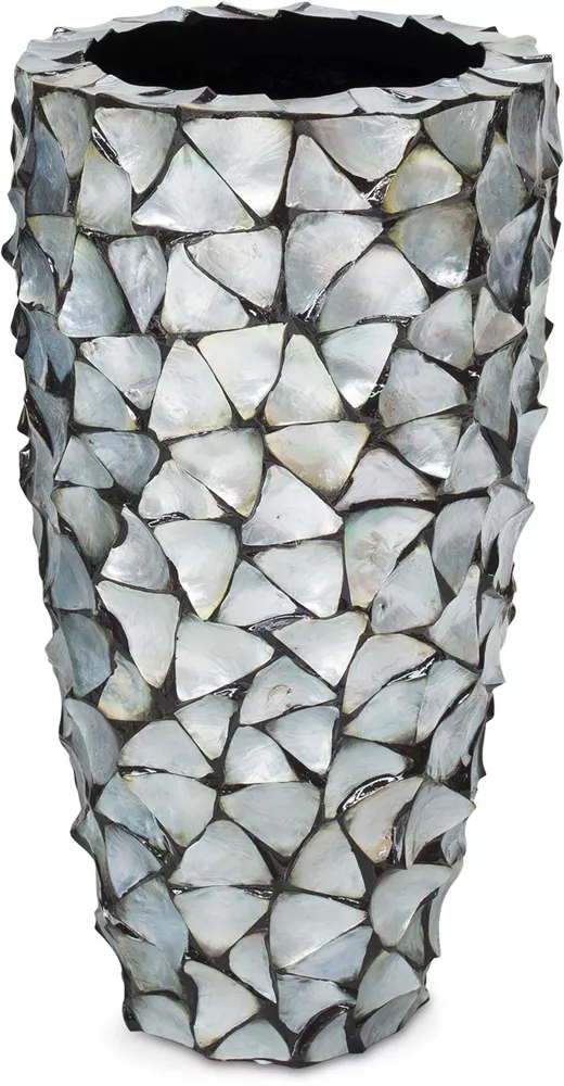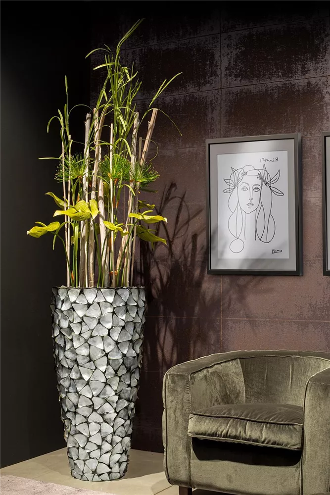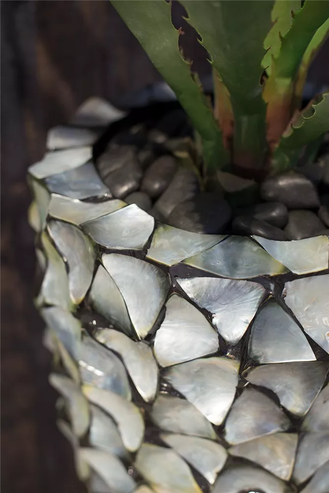 Echte, in Handarbeit aufgebrachte Muscheln machen die Produkte der Serie zu einem exklusiven und schimmerndem Highlight in jeder Dekoration. Mit großem Aufwand und in Präzision werden die drei- und rechteckigen Muschelstücke aus weißem, braunem, schwarzem oder silber-blauem Perlmutt auf den Korpus der Artikel aufgebracht, bevor sie verfugt und abschließend noch einmal überarbeitet werden. Zu der Serie gehören neben je vier Pflanzgefäßen in verschiedenen Formen und Größen, auch Schalen, Tischgefäße, Säulen und Orchideentöpfe und geben Ihnen somit die Möglichkeit, die Muschel-Gefäße als stimmungsvolles und exklusives Gesamtkonzept anzubieten.