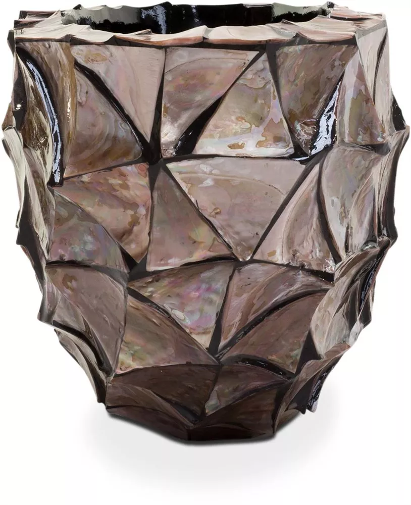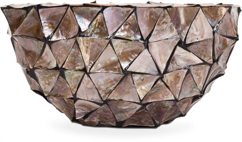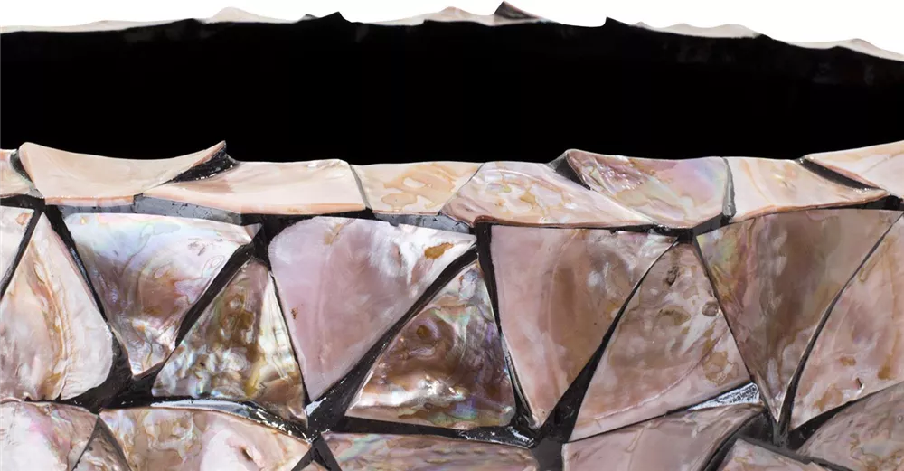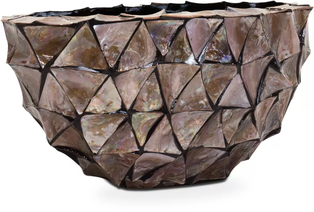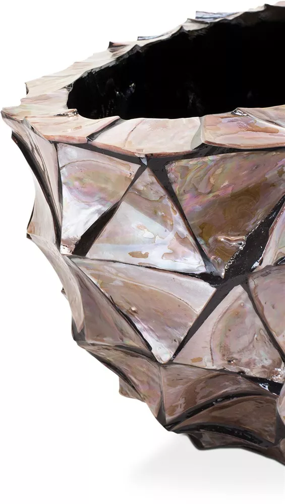 Echte, in Handarbeit aufgebrachte Muscheln machen die Produkte der Serie zu einem exklusiven und schimmerndem Highlight in jeder Dekoration. Mit großem Aufwand und in Präzision werden die dreieckigen Muschelstücke aus braunem Perlmutt auf den Korpus der Artikel aufgebracht, bevor sie verfugt und abschließend noch einmal überarbeitet werden. Zu der Serie gehören Pflanzgefäße, Schalen, Tischgefäße, Säulen und Orchideentöpfe und geben Ihnen somit die Möglichkeit, die Muschel-Gefäße als stimmungsvolles und exklusives Gesamtkonzept anzubieten.
