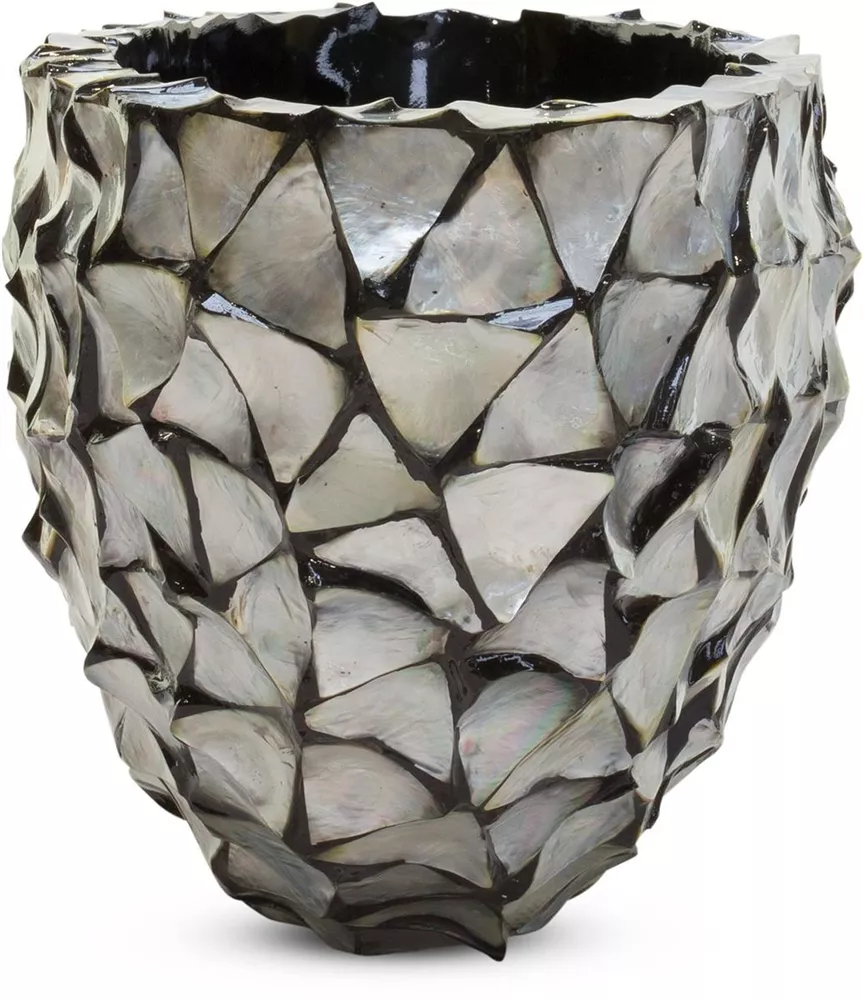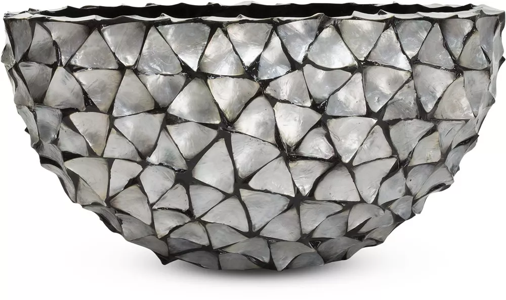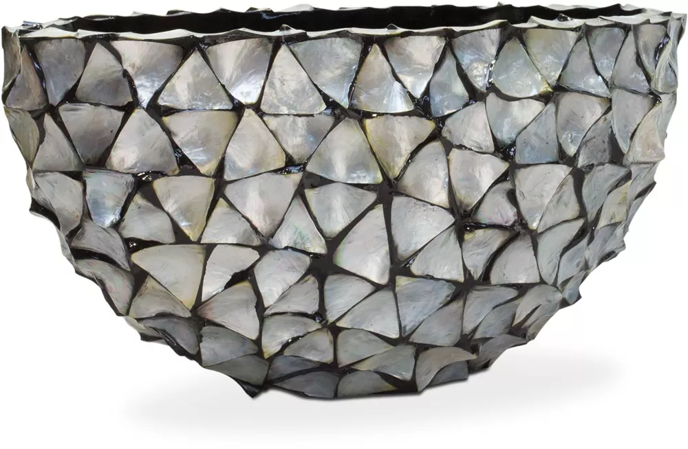 Echte, in Handarbeit aufgebrachte Muscheln machen die Produkte der Serie zu einem exklusiven und schimmerndem Highlight in jeder Dekoration. Mit großem Aufwand und in Präzision werden die dreieckigen Muschelstücke aus silber-blauem Perlmutt auf den Korpus der Artikel aufgebracht, bevor sie verfugt und abschließend noch einmal überarbeitet werden. Zu der Serie gehören Pflanzgefäße, Schalen, Tischgefäße, Säulen und Orchideentöpfe und geben Ihnen somit die Möglichkeit, die Muschel-Gefäße als stimmungsvolles und exklusives Gesamtkonzept anzubieten.