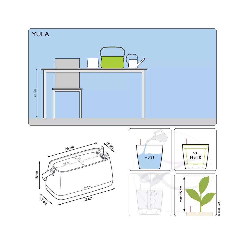 Kleine Wohnungen können mit der modernen YULA-Collection schnell und einfach dekoriert werden. Dabei müssen die Pflanzen nicht einmal umgetopft werden, sondern können in ihrem Growpot bleiben, werden mit einem Stick versehen und in das Pflanzgefäß oder die Pflanztasche gesetzt. Im Anschluss einfach das Wasserreservoir auffüllen und die Pflanzen werden über das Sticksystem gleichbleibend mit Wasser versorgt. Damit ist die YULA-Collection perfekt für alle, die ihre Wohnung mit Pflanzen schön dekorieren möchten, selbst aber keinen grünen Daumen haben. Mit harmonischen Pastellfarben, matten Oberflächen und cleanen Formen können die YULA-Pflanzgefäße im handlichen Tischgefäß-Format in jede Einrichtung integriert werden.