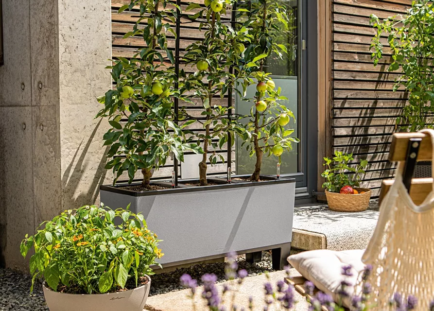 Das Pflanzgefäß TRIO Stone 30 bietet sich als Sichtschutz oder kleines Beet für Gärten, Terrassen oder größere Balkone an. Ob zum Begrünen von Wänden in Kombination mit dem passenden Rankgitter oder als Hochbeet mit dem zusätzlich erhältlichen Sockel – mit dem Pflanzgefäß TRIO Stone 30 entsteht ganz einfach ein grüner Sichtschutz, der nicht nur schön aussieht, sondern mit Naschobst und Gemüse bepflanzt, auch für eine eigene leckere Ernte sorgt.