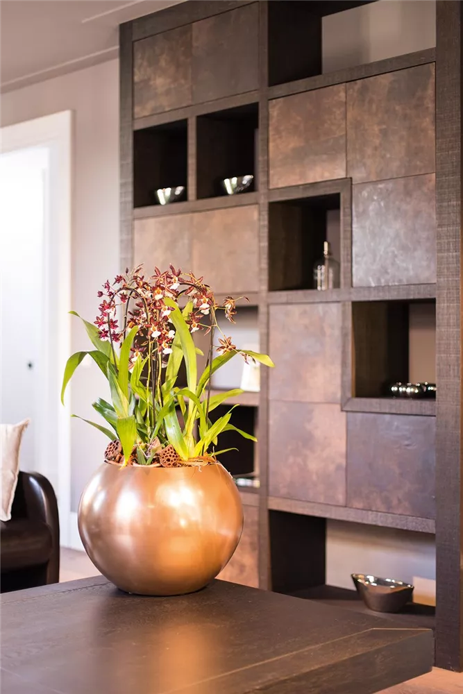 Die kugelrunden GLORY Pflanzgefäße überzeugen mit ihrer edlen Farbgebung und sind sowohl für natürliches Grün als auch floristische Arrangements bestens geeignet. Ein schönes zusätzliches Detail ist der breite eingezogene Rand. Hergestellt wird GLORY aus einer Materialkombination bestehend aus Kunststoff und echten Bronze bzw. Alupigmenten. Daher sind sie vergleichsweise leicht und robust und lassen sich auch im Außenbereich einsetzen (für den Außeneinsatz kann problemlos ein Ablauf in den Gefäßboden gebohrt werden). Eine Wachsbeschichtung verleiht der bronzefarbenen Variante zusätzlichen Glanz. Durch Oxidationsprozesse entsteht bei beiden Farbvarianten mit der Zeit eine echte, natürlich anmutende Patina.