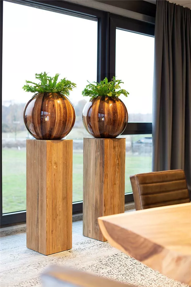 Eine ideale Ergänzung zu Schalen, Vasen und Skulpturen sind die TEAK-Säulen aus 100% recyceltem Teak-Holz. Sowohl in privaten Wohnräumen als auch in der Shop-Einrichtung – nicht zuletzt in der Schaufensterdekoration - machen sie Ihre Highlights zum Eyecatcher und zaubern ein natürliches Flair. Die Säulen sind in acht verschiedenen Größen erhältlich. Das verwendete Teak-Holz stammt aus alten indonesischen Gebäuden, Farmanlagen oder Schiffen. Statt den Naturstoff zu vernichten, wird es für die Möbelproduktion in einem aufwändigen Prozess recycelt. Aufgrund seines Alters und der Lagerung ist das Holz durchgetrocknet, allerdings kann die variierende Luftfeuchtigkeit zwischen dem Herkunftsland und Europa zu leichten Veränderungen im Holz führen. Mangelnde Luftfeuchtigkeit kann – wie bei allen Holzmöbeln – Holzrisse verursachen. Daher stellen etwaig auftretende Spannungs- bzw. Setzrisse keinen Qualitätsmangel dar und berechtigen nicht zur Beanstandung. Es sei denn, die Nutzung der Ware wird hierdurch wesentlich beeinträchtigt. Vor allem in der Heizperiode ist daher für ein angemessenes Raumklima zu sorgen. Bei Fußbodenheizungen empfehlen sich zusätzliche Feuchtigkeitsspender im Raum.