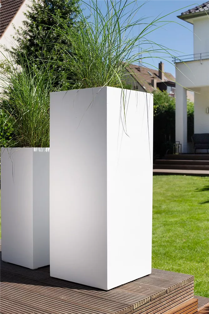 Die matt weiße Pflanzsäule TRIBECA BLOCK ist für einen Einsatz im Innen- als auch Außenbereich geeignet. Für eine Platzierung auf Terrasse oder Balkon können problemlos Löcher in den Gefäßboden gebohrt werden. Die Pflanzsäule ist aus glasfaserverstärktem Kunststoff hergestellt und hat eine hochwertige 2K-Beschichtung. Dank ihrer reduzierten Formgebung harmoniert die moderne Pflanzsäule mit vielen Einrichtungen und bietet ein attraktives Gestaltungselement im Outdoorbereich. Darüber hinaus lässt sich der hohe Pflanzkübel auch wunderbar mit weiteren Pflanzgefäßen kombinieren.