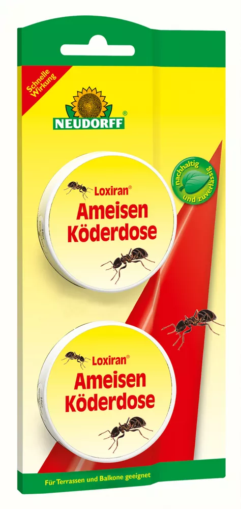 Gebrauchsfertige Köderdose mit natürlichem Wirkstoff zur Bekämpfung von Ameisen. Ideal für den Einsatz auf Terrasse, Balkonen, Wegen sowie in Wohnräumen. Biozid.