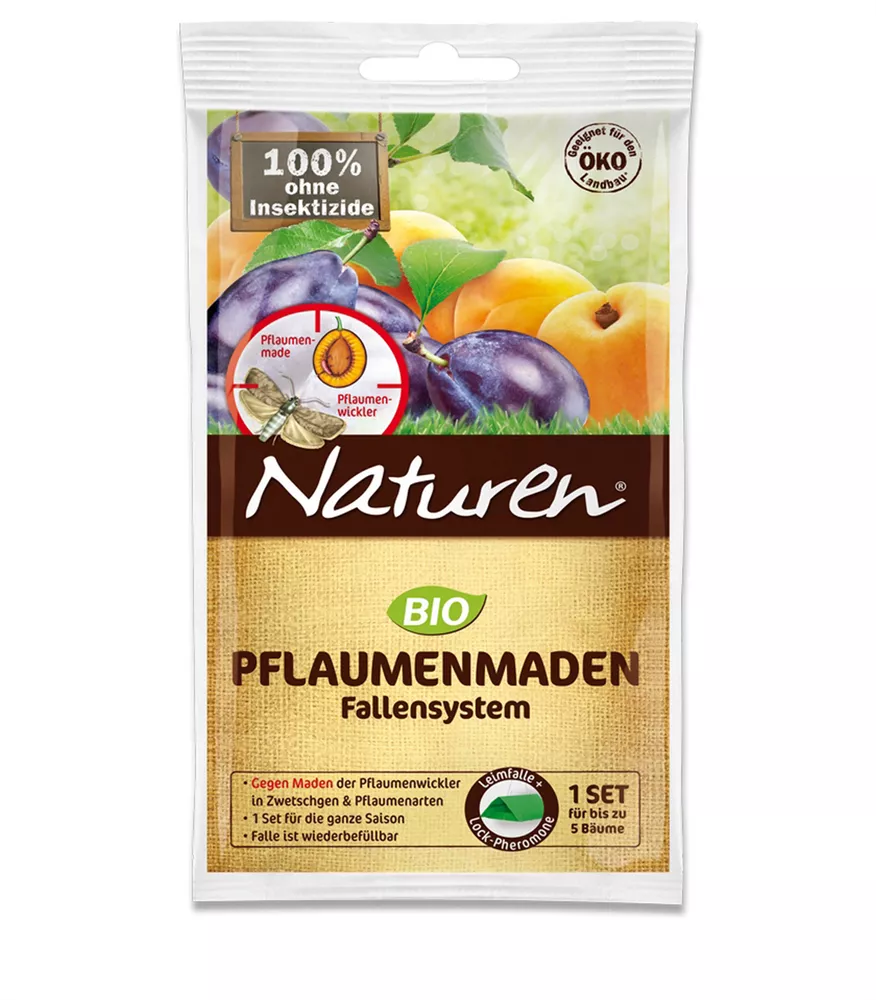 Biotechnische Falle zum Abfangen der Pflaumenwicklermännchen. Die spezielle Pheromon-Formulierung sowie das Grün der Falle haben keine Lockwirkung auf Nutzinsekten und andere Falterarten. Die Männchen des Pflaumenwicklers werden durch den Sexuallockstoff in die Falle gelockt und bleiben auf dem Leim kleben. Dadurch bleiben die Weibchen unbefruchtet und legen keine Eier ab, aus denen die schädlichen Raupen des Pflaumenwicklers schlüpfen können. Nach 5 bis 6 Wochen, Ende Juni, Anfang Juli sollen der Leimboden und die Pheromon-Kapsel gewechselt werden, um die zweite Generation des Schädlings anlocken und fangen zu können. Fallenkörper nach der Ernte oder Anfang August entfernen und für nächstjährige Anwendung trocken aufbewahren. Erfahrungsgemäß wird ein ausreichendes Abfangen der Pflaumenwicklers erreicht, wenn eine Falle für 3 bis 5 in direkter Umgebung stehende Bäume eingesetzt wird. Für die Substral Naturen Pflaumenmaden-Falle gibt es ebenfalls im Handel ein praktisches Nachrüstset.