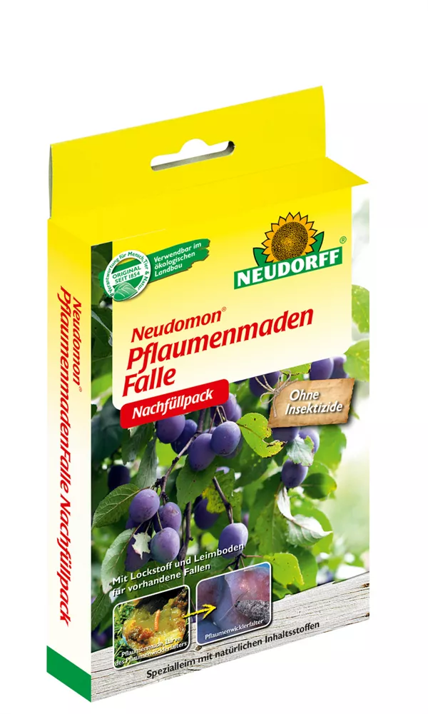 Das Set besteht aus 2 Leimböden und 2 Pheromonkapseln gegen Maden in Pflaumen und Zwetschgen. Zur Nachbestückung einer vorhandenen Neudomon-Falle.