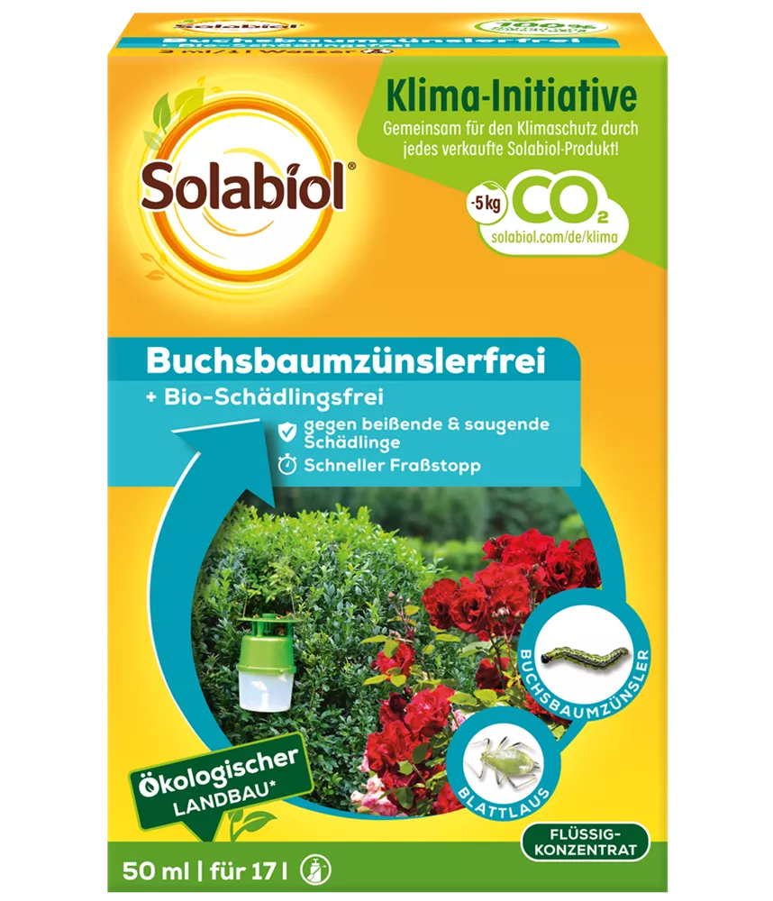Spezial-Spritzmittel gegen den Schrecken der Gärten – den Buchsbaumzünsler. Der natürliche Wirkstoff stoppt schnell den Fraß der Raupe und verhindert dessen Weiterentwicklung zum Falter. Eine mehrfache Anwendung im Jahr ist zugelassen, so können auch mehrere Generationen in der Saison bekämpft werden.