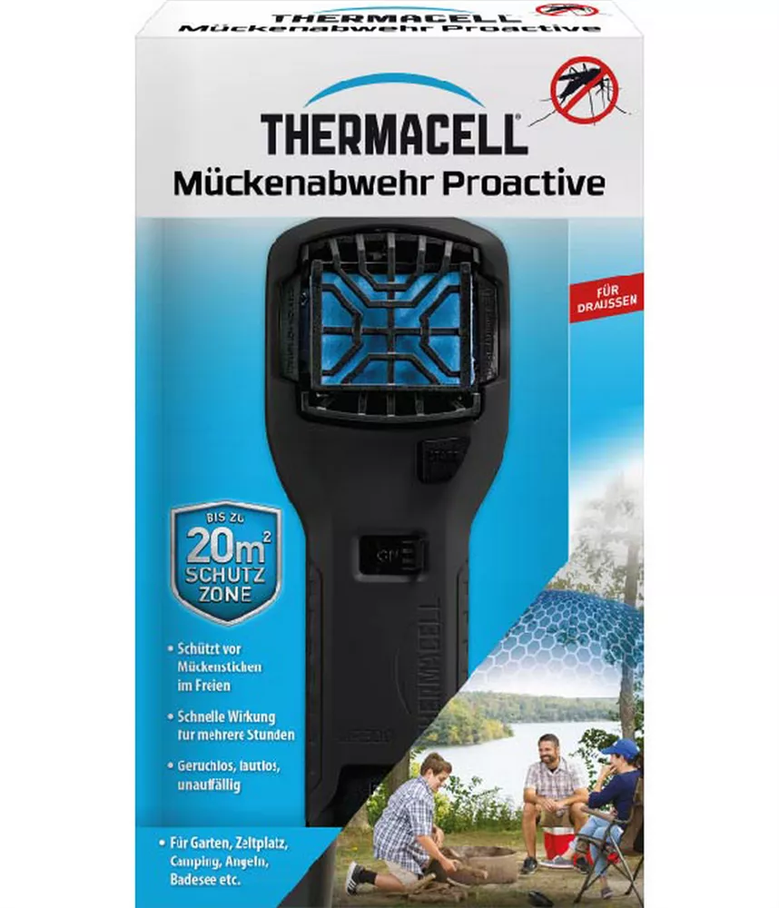 Die als kompaktes Handgerät flexibel im Außenbereich einsetzbare THERMACELL® Mückenabwehr Proactive schafft in kurzer Zeit eine 20 m² große Schutzzone gegen Stechmücken / Gelsen (auch asiatische Tigermücke). Das Funktionsprinzip der THERMACELL® Geräte basiert auf dem Verdampfen eines Wirkstoffes durch Erhitzung der Wirkstoffplättchen ohne offene Flamme und Geruchsbelästigung.