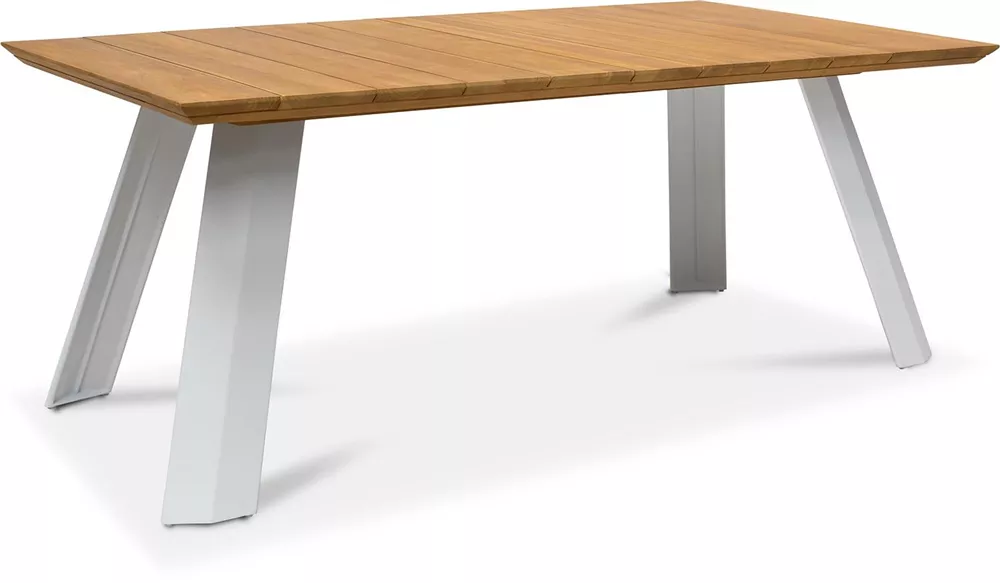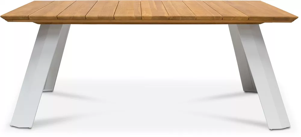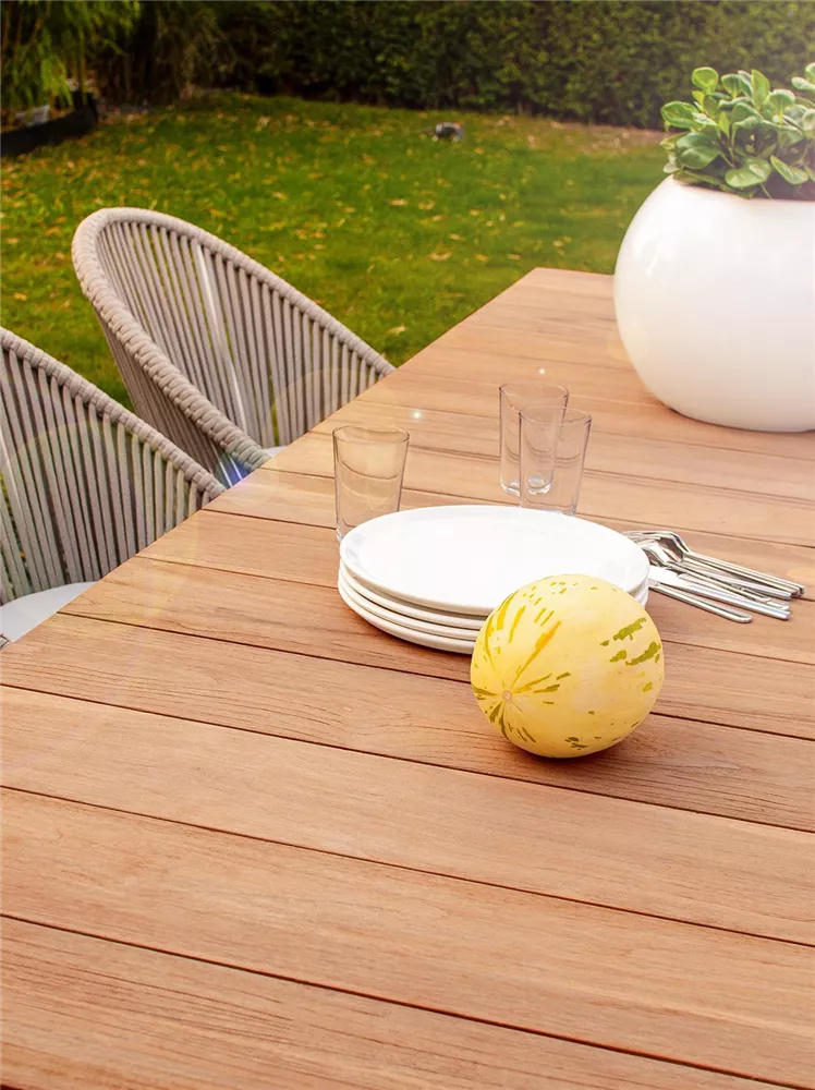 Eine hochwertige Materialkombination macht Gartentisch BALI zu einem stilvollen und langlebigen Möbelstück auf Terrasse oder Balkon. Die Tischplatte ist aus massivem Plantagenholz in Planken-Optik gefertigt und stellt einen schönen Kontrast zum stabilen Untergestell aus Aluminium-Guss dar, dessen Oberfläche eine matt-weiße, sandartige Pulverbeschichtung hat. Die Kanten der Tischplatten sind unterschnitten und wirken besonders schön in Kombination mit den ausgestellten Tischbeinen.